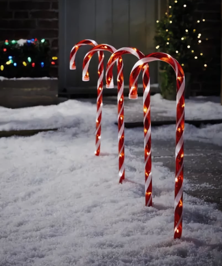 Lining your walkway with candy cane stakes adds a cheerful, nostalgic touch. Whether they light up or just add color, they make every approach to the house feel festive. You can find them in all sizes, from classic red and white to modern pastel versions. I like pairing them with snow-dusted greenery for contrast.