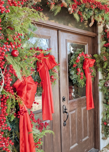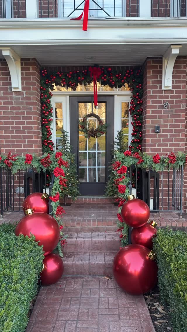 It frames your entryway beautifully and looks stunning when seen from the street. The light reflecting off the garland creates such a warm, inviting atmosphere. It’s one of those classic holiday looks that never goes out of style.