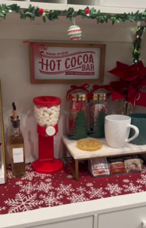 Set up a small table or shelf with mugs, cocoa mix, and candy canes for guests or family. Add a little sign that says “Warm up here” and decorate the space with greenery and lights. It feels like a sweet winter tradition, especially if you have gatherings or carolers stopping by.
