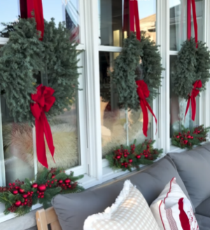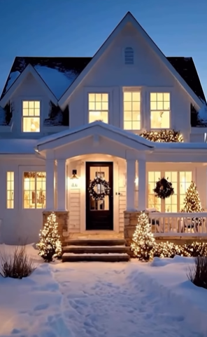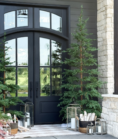 The symmetry feels clean and welcoming, and at night, they glow like something out of a Christmas storybook. I love how the scent of pine mixes with the crisp winter air as you walk up to the porch.