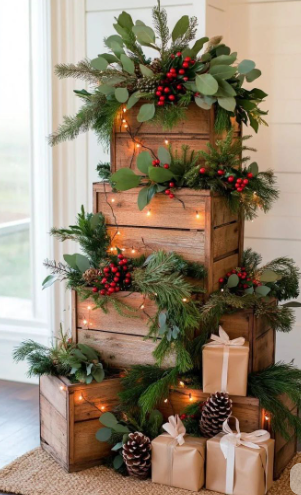 I like to add a little plaid fabric inside each crate for warmth. It’s a setup that looks charming during the day and even more magical when lit by string lights at night. The uneven heights create dimension, making your porch feel like a curated holiday vignette.