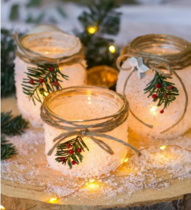 Glass jars filled with frosted candles create the prettiest glow on chilly nights. You can make them yourself with a bit of faux snow spray or Epsom salt for that snowy texture. Arrange them along steps or in clusters near the door. The gentle light reflects through the frosted glass, making everything sparkle softly.