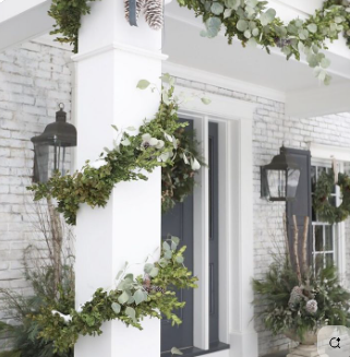 It’s such a lovely way to use vertical space without cluttering the ground. The natural colors pop beautifully against snow or white siding, giving the porch a peaceful, wintery glow.
