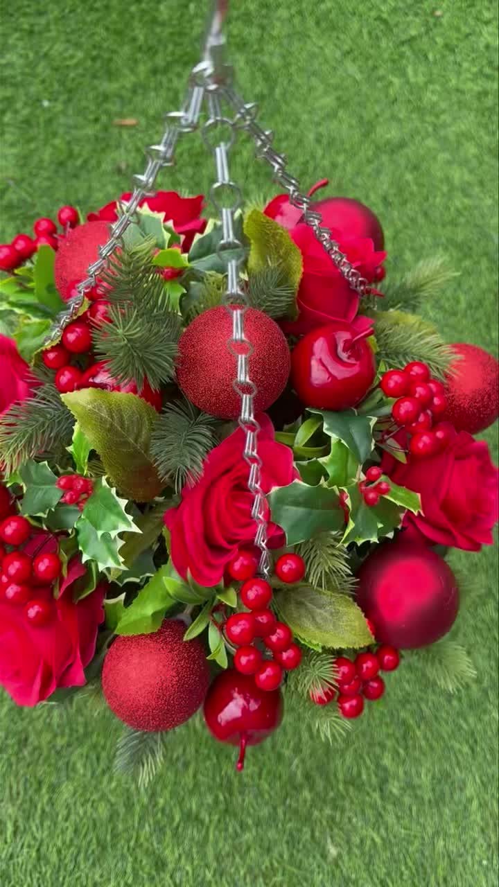 If you usually have hanging baskets for flowers, switch them out for winter greenery. Fill them with fir branches, eucalyptus, and faux berries for a lush, seasonal look. A few pinecones tucked in make it feel woodsy and natural. When the breeze moves through, everything sways gently, adding life and motion to the porch.