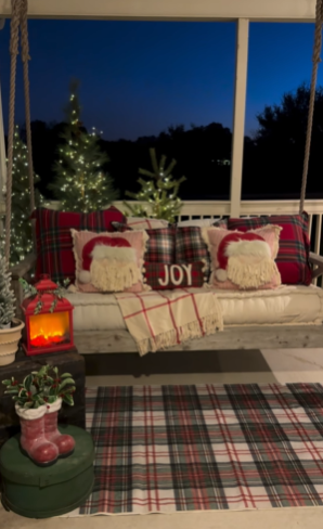 If you’re lucky enough to have a swing or bench, make it cozy for the holidays. Drape chunky knit blankets and toss a few plaid or faux fur pillows on top. Add a small tray with pine sprigs or candles for decoration. The layered textures create warmth, and it becomes a little retreat where you can sip cocoa and watch snowflakes fall.