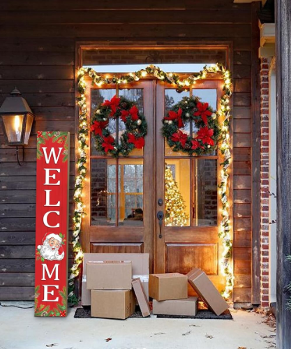 A wooden Christmas sign leaning beside your front door adds such an inviting, homemade touch. You can hand paint phrases like “Joy to the World” or “Welcome Home” for a personal feel. The texture of aged wood brings warmth and contrast against winter greenery.
