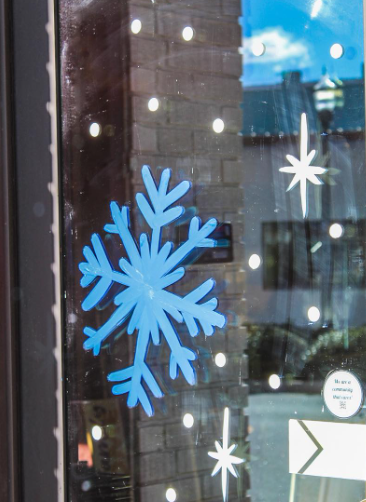 Large snowflake cutouts on porch windows add whimsy and sparkle. You can make them from paper, metal, or even white vinyl decals. When light filters through them, the patterns look beautiful from inside and out.