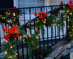 If your porch has steps, wrapping the railing with strands of warm white lights creates pure magic. The glow guides guests up the walkway and adds depth to your decor once the sun goes down. You can weave in strands of greenery or tie bows at each post for a more festive touch.