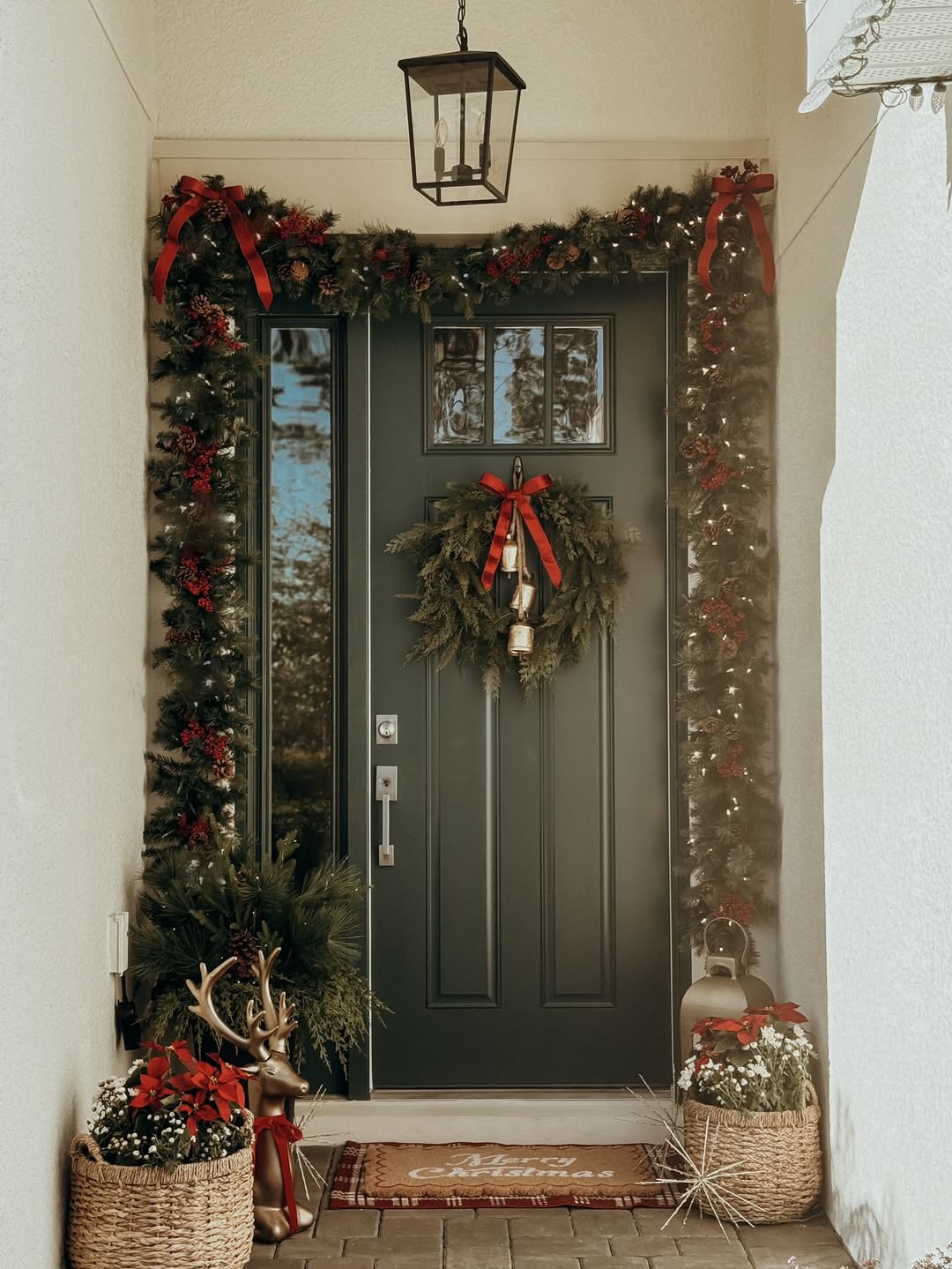 I like adding warm toned lights throughout the garland so it glows gently at night. A few pinecones or ribbon ties give it a friendly, homey feel. The whole setup frames the doorway in a way that feels festive yet timeless, creating a lovely moment before guests even step inside.