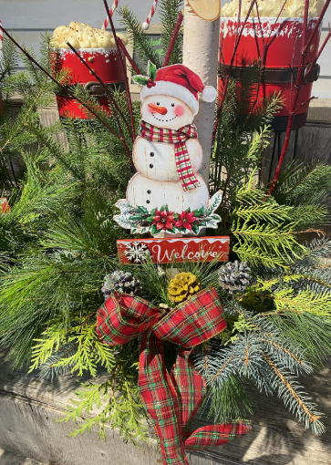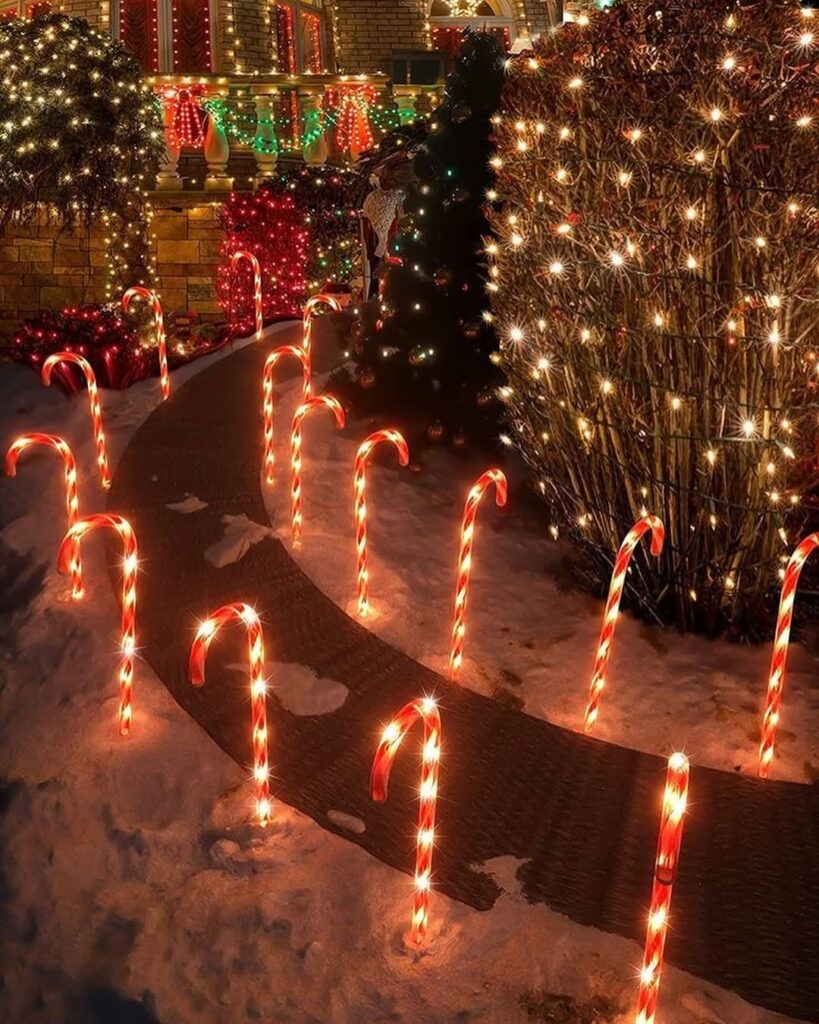 Candy cane stakes bring a cheerful, whimsical energy to walkways and garden beds. Their bright colors stand out beautifully against winter greenery, creating a fun little path for guests to follow. I like mixing sizes so the scene feels lively but still balanced.