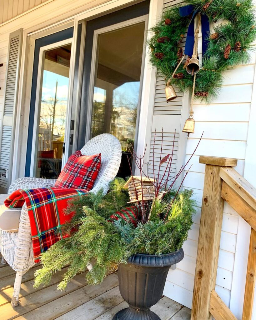 Arranging a cozy seating area on your porch can turn the space into a charming winter moment, even if you do not plan to sit outside much. Place a thick outdoor blanket over a chair, add a small lantern beside it, and tuck a little winter greenery into a basket nearby.
