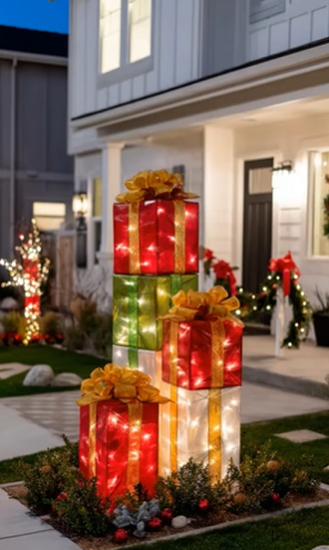 Placing decorative gift boxes on your porch or lawn adds a playful sense of anticipation to your outdoor decor. These boxes often have built in lights that create a warm glow from within, making them look magical in the evening. I like arranging them in different sizes so the group feels dynamic and full of personality.