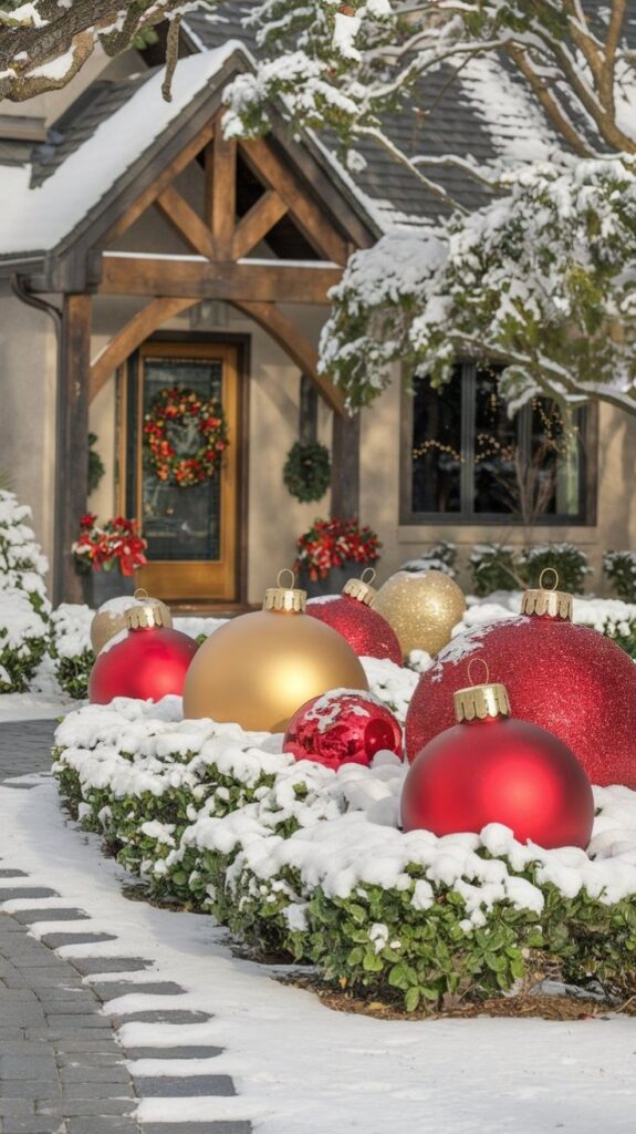 Gathering a group of oversized ornaments in one corner of your yard creates a bold, cheerful focal point that feels a bit playful without going over the top. Choose ornaments in different finishes, like glossy, satin, or glitter styles, which catch the light in fun ways as the sun moves.