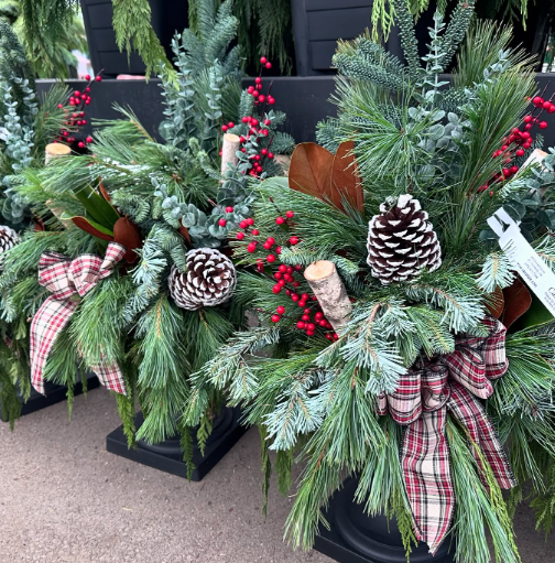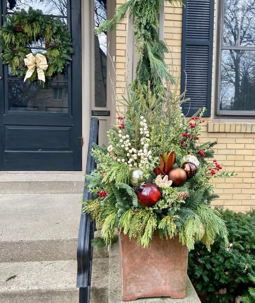 Tall outdoor urns filled with winter greenery create a polished entrance that feels elegant yet relaxed. I like combining cedar, pine, and magnolia leaves so the arrangement has depth and subtle color shifts. A few berry branches or ornament picks add gentle sparkle. Placing one urn on each side of the door creates a balanced frame that feels welcoming.