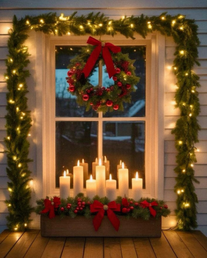 Placing warm window candles in each front facing window creates a calm, classic look that feels both welcoming and serene. The gentle light has a peaceful quality that pairs beautifully with winter evenings. I like choosing candles with a soft amber tone because the glow looks especially soothing from a distance.