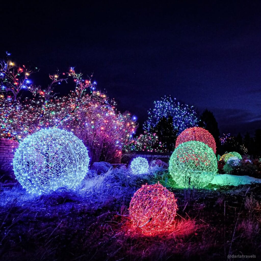Glowing garden spheres scattered across the yard create a magical effect that feels dreamy and atmospheric. These orbs give off a soft light that blends beautifully with winter landscapes. I like grouping three or five in a single area so the arrangement feels intentional and nicely balanced. You can place them on grass, nestled in mulch, or beside low shrubs.