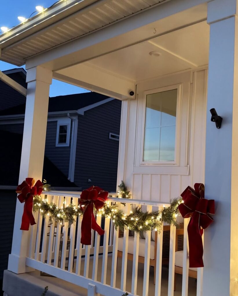 You can weave the strand loosely for a casual look or tuck it in tightly for a more polished style. I like adding evergreen garlands and velvet bows so the whole rail feels lively. And when you switch the lights on at dusk, the porch seems to settle into a cozy mood that feels perfect for calm winter evenings.